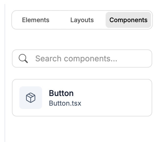 Your saved components appear here. Drag one onto the canvas to use it. Each component shows its name and source file (e.g. Button.tsx).