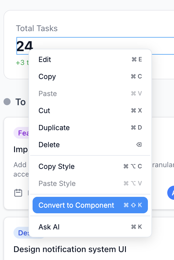 Right-click any element on the canvas and select Convert to Component (⌘⇧K / ⌃⇧K).