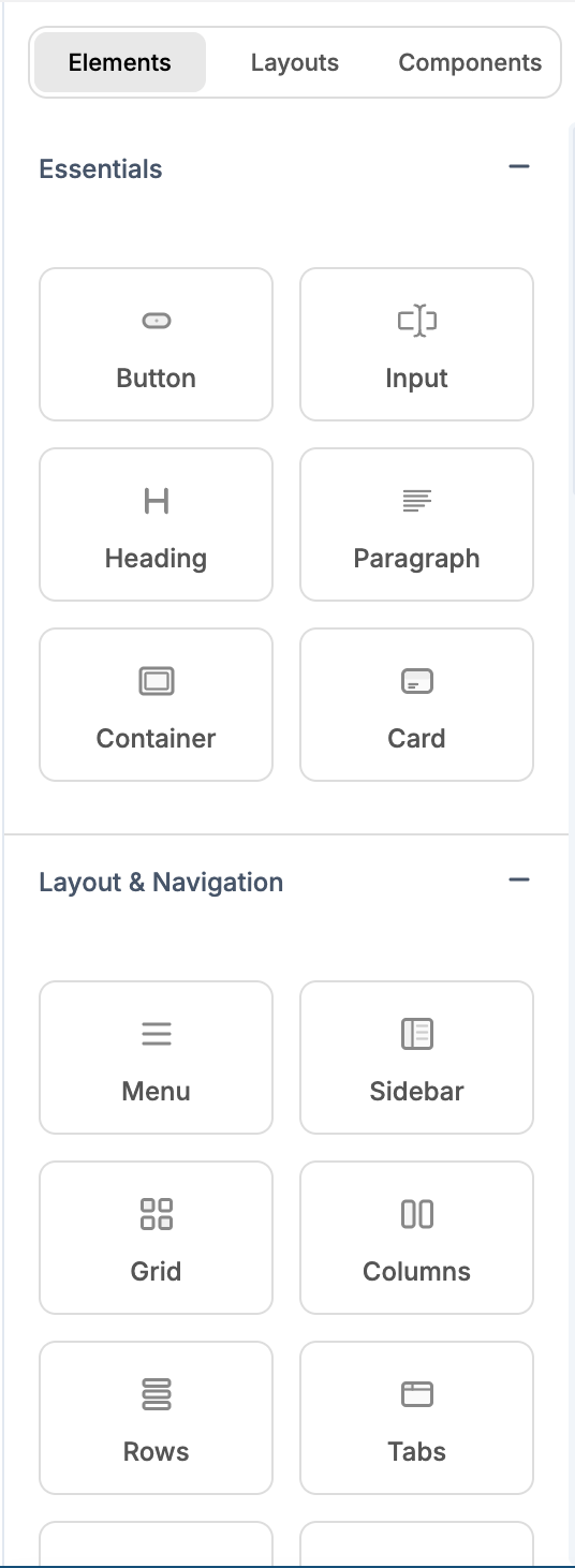 The Elements panel is where you add things to your page. Click the + icon in the left sidebar to open it. It has three tabs: Elements, Layouts, and Components.