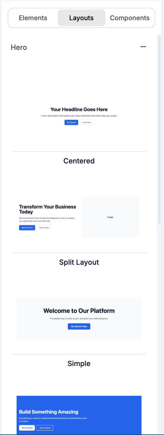 The Layouts tab has pre-built sections you can drop onto your page. Each one is a ready-made block with placeholder content that you can customize.