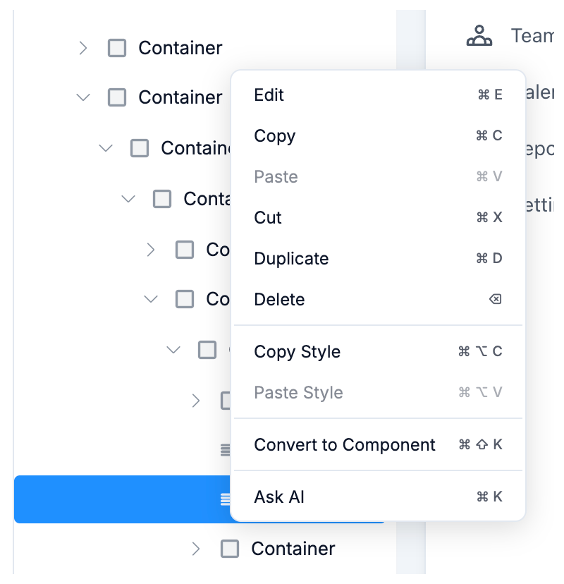 This gives you access to Edit, Copy, Cut, Duplicate, Delete, Copy/Paste Style, Convert to Component, and Ask AI - the same options as right-clicking on the canvas.