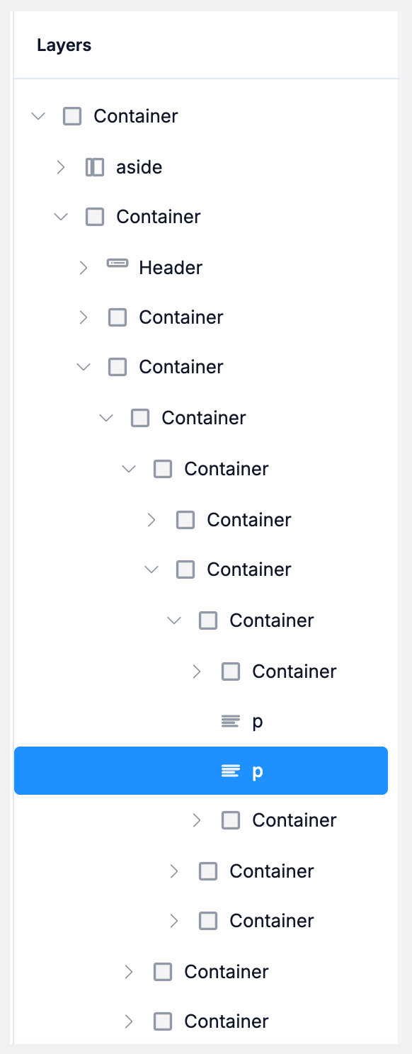 The Layers panel shows every element on your page as a nested tree. Open it by clicking the Layers icon in the left sidebar.
