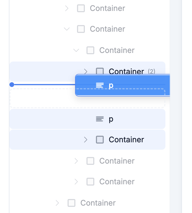 Drag elements up and down in the tree to reorder them. You can move elements within the same container or drag them into a different container. The canvas updates immediately.