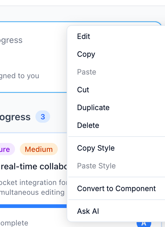 Right-click any element on the canvas to open the context menu.